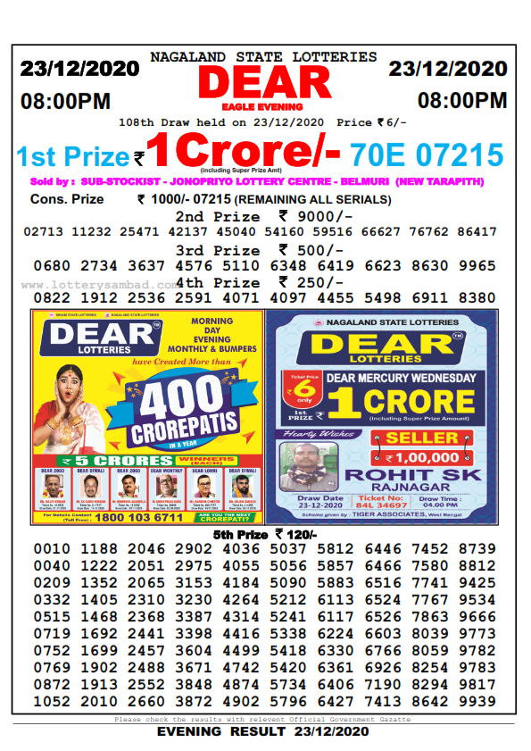 লটারি সংবাদ 23.12.2020 Sikkim Result 11:55 AM and 4 PM