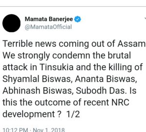Some Bengali organisations have called a 12-hour bandh in Tinsukia district on Friday. West Bengal Chief Minister Mamata Banerjee slammed the Centre for the incident. In a tweet, Banerjee wrote about the incident of Thursday night, in which she asked whether this was a result of the National Register of Citizens (NRC). “Is this the outcome of recent NRC development?” she asked. The Trinamool Congress will organise several rallies in different parts of north and south Bengal, including Siliguri and Kolkata to protest the killings, Banerjee tweeted.