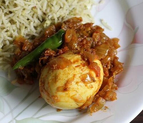 Rice, dal, vegetables and egg on every plate.