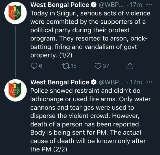 The BJP is planning to call a 12-hour bandh in North Bengal on Tuesday. Meanwhile, West Bengal Police took to Twitter to state that: “Today in Siliguri, serious acts of violence were committed by the supporters of a political party during their protest program. They resorted to arson, brick-batting, firing and vandalism of govt property. Police showed restraint and didn’t do lathicharge or used fire arms. Only water cannons and tear gas were used to disperse the violent crowd. However, death of a person has been reported. Body has been sent for PM. The actual cause of death will be known only after the PM.”