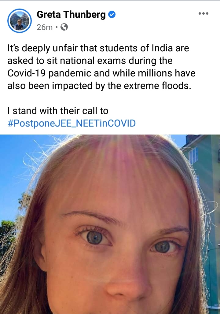 Climate activist Greta Thunberg on Tuesday said that she is supporting the call of students to postpone the NEET JEE examinations in India. In her Facebook account, the youth icon wrote: “It’s deeply unfair that students of India are asked to sit national exams during the COVID-19 pandemic and while millions have also been impacted by the extreme floods. I stand with their call to #PostponeJEE_NEETinCOVID”. The same message was also posted on her official Twitter account, that has over four million followers.
