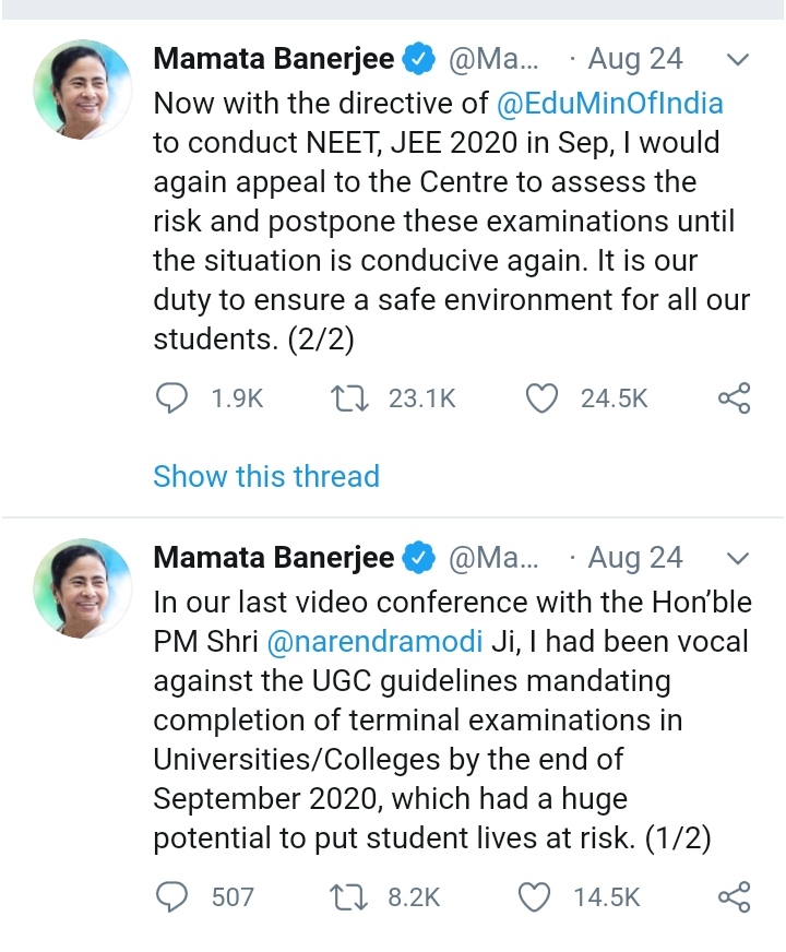 There has been a nation-wide demand for postponement of the examinations with the hashtag “MODIJI_POSTPONEJEENEET” trending on social media. The NEET JEE exams were cancelled in May when lockdown was imposed and are now scheduled in the first half of September. The Supreme Court has dismissed petitions for postponement saying “life cannot be stopped”.