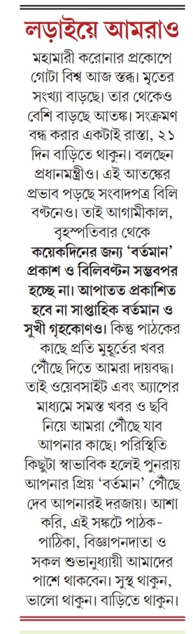 The unusual situation has led the management of the Bengali newspaper, Bartaman, to announce that the print edition will be stopped for a while now. There won’t be any print edition from Thursday, March 26, it was announced today. The online edition however, will be available, apart from news through the app. The authorities have promised to bring back the newspaper’s print edition soon.