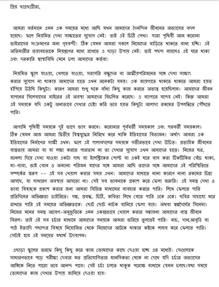 She wrote in the two-page letter (read the letter below in Bengali) that in the days ahead, people will look back into the past and refer to events to have taken place “before” or “after” Coronavirus. Gupta said that it is thus important to look at this time we are going through as something significant, and to think deeply about this transition. She pointed out that this is an opportunity now to look closely at the simple things in our daily life that we may never have looked at before – like a tree outside the window, an electric light post, the life of a lizard living in our room and to explore the essence of our relations with parents, siblings and other members of the family.