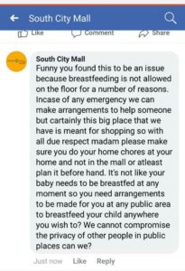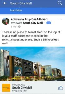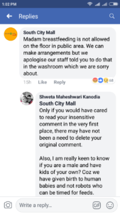 This comment was later deleted. However, even later, a comment from South City Mall read thus: “Madam breastfeeding is not allowed on the floor in public area. We can make arrangements but we apologise our staff told you to do that in the washroom which we are sorry about.”