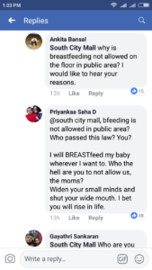 This comment prompted some to ask, like Ankita Bansal did: “South City Mall, why is breastfeeding not allowed on the floor in public area? I would like to hear your reasons.” Another comment from Priyankaa Saha D asked “who passed this law”.
