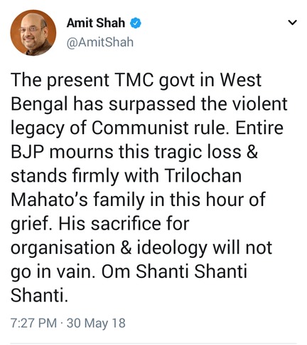 A couple of days ago, BJP President Amit Shah had tweeted, “Deeply hurt by the brutal killing of our young karyakarta, Trilochan Mahato in Balarampur, West Bengal. A young life full of possibilities was brutally taken out under state’s patronage. He was hanged on a tree just because his ideology differed from that of state sponsored goons.”