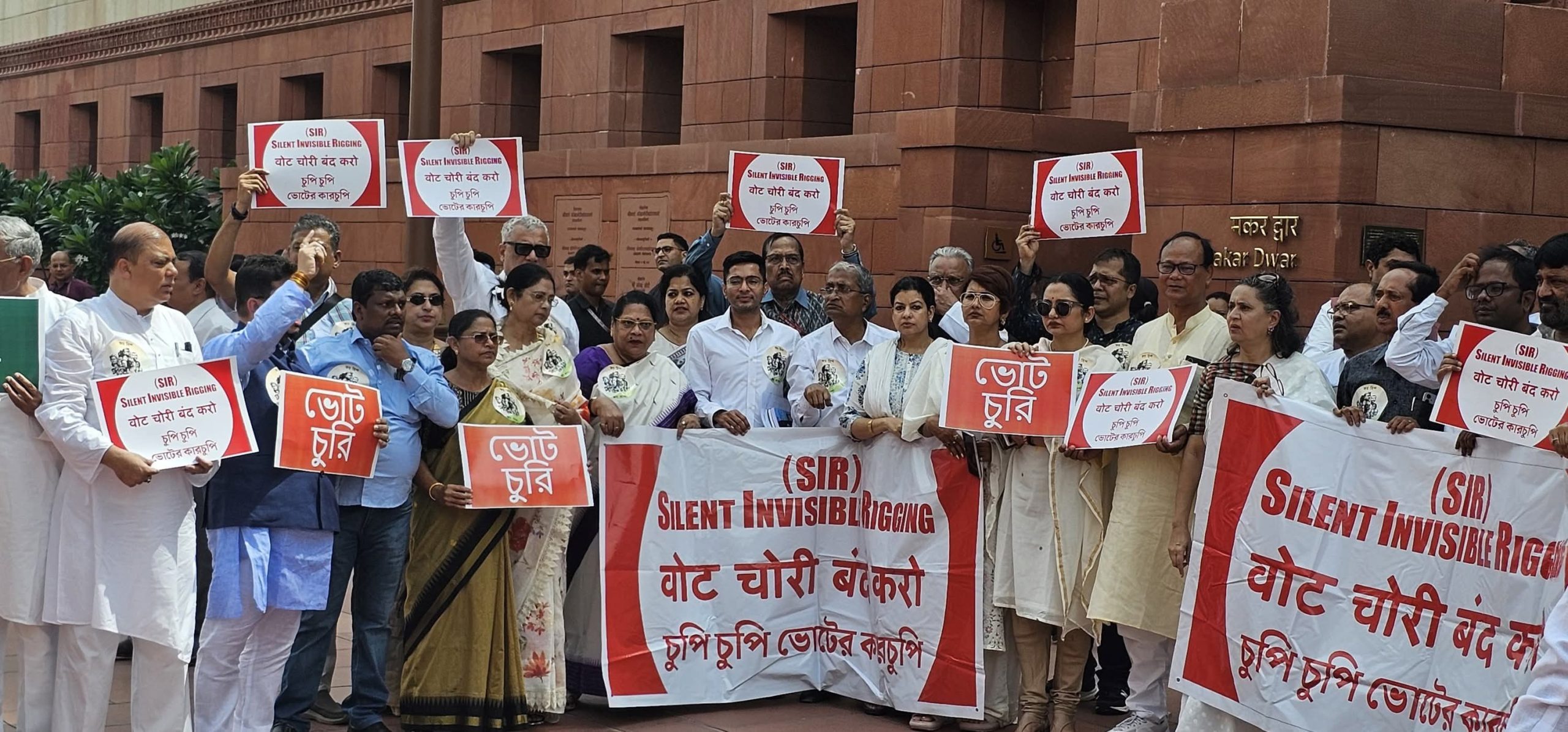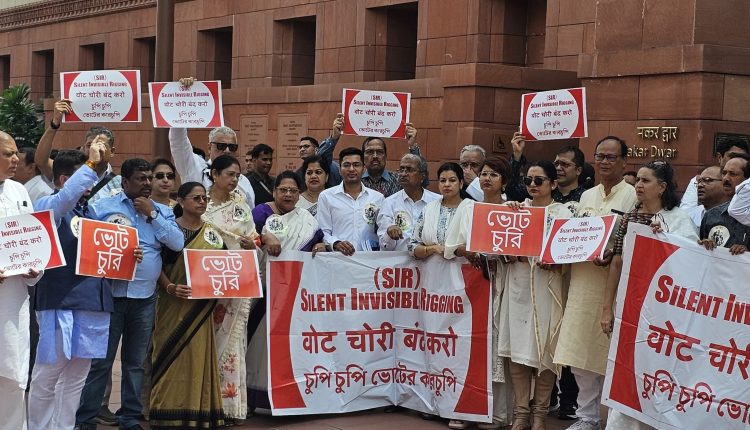শুক্রবার সংসদ চত্বরে তৃণমূলের পাশাপাশি বিক্ষোভ দেখা কংগ্রেস এবং অন্য বিরোধী দলও। নির্বাচন কমিশনের সঙ্গে হাত মিলিয়ে বিজেপি ভোট চুরি করছে, এই অভিযোগেও এ দিন সরব হয় ইন্ডিয়া জোট।